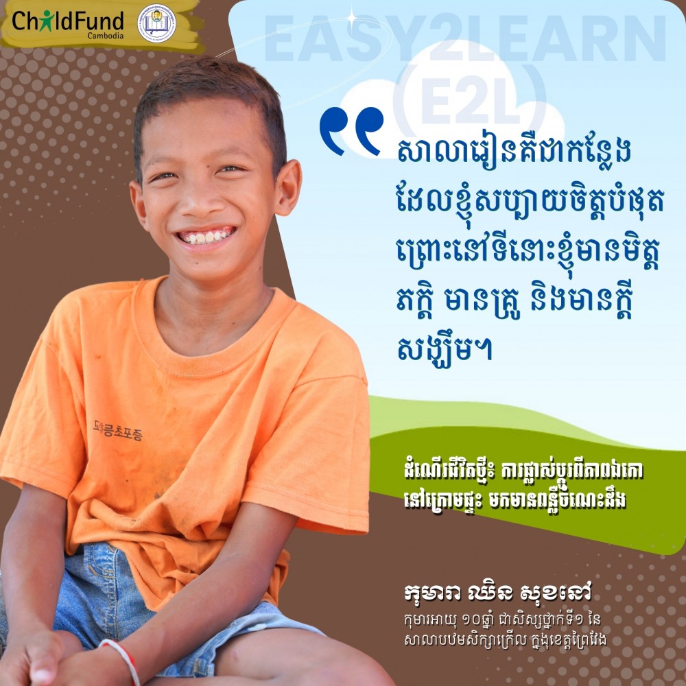Everything changed when the Easy2Learn (E2L) project, implemented by KAPE with financial support from ChildFund Cambodia, intervened. The project identified Soknov’s situation through the school director, prompting his mother to enroll him in Grade 1 at Kreul Primary School. The school operates in two shifts, from 7:00 AM to 11:00 AM and 1:00 PM to 5:00 PM, allowing students to receive comprehensive education in Khmer language, mathematics, and science.